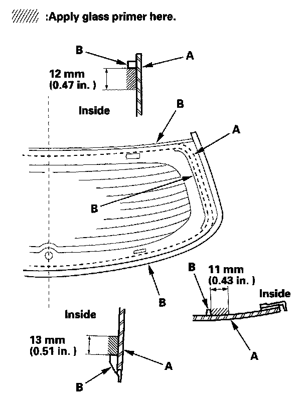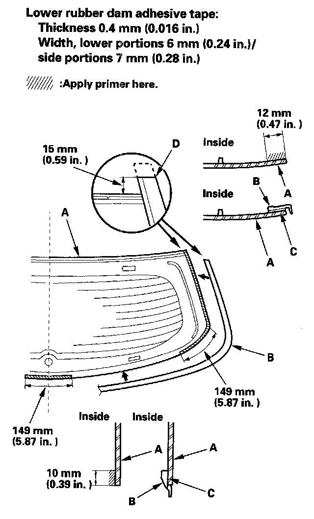 12. Apply primer to the edge of the rear window (A) where the lower rubber dam adhesive tape will be attached as shown. Attach the lower rubber dam (B) with adhesive tape (C) along the edge of the rear window: