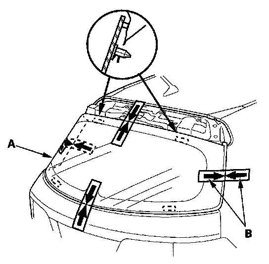 14. If a new glass is used set the rear window (A) in the opening, and center it. Make alignment marks (B) across the rear window and body with a grease pencil at the four points shown. Be careful no to touch the rear window where adhesive will be applied.