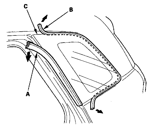 2. Remove the front seal (A) and molding quarter seal (B) from the front edge of the quarter glass (C). If necessary, cut the seals with a utility knife.