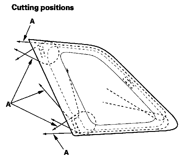 4. With a helper on the outside, pull the piano wire (A) back and forth in a sawing motion. Hold the piano wire as close to the quarter glass (B) as possible to prevent damage to the body, and carefully cut through the adhesive (C) around the entire quarter glass.
