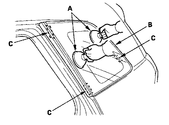 18. Use suction cups (A) to hold the quarter glass (B) over the opening, align it with the clips (C) and set it down on the adhesive. Lightly push on the quarter glass until its edges are fully seated on the adhesive all the way around.