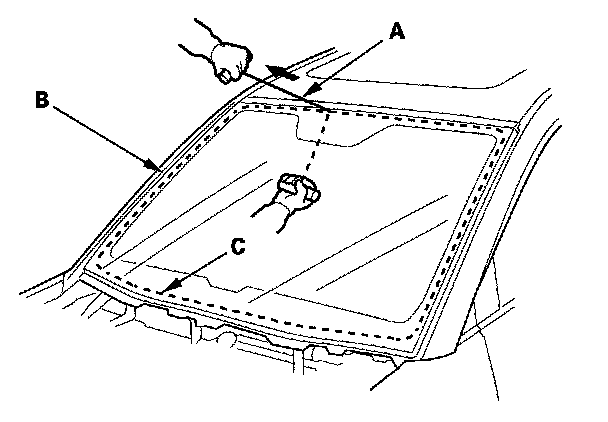 6. With a helper on the outside, pull the piano wire (A) back and forth in a sawing motion. Hold the piano wire as close to the windshield (B) as possible to prevent damage to the body and dashboard. Carefully cut through the rubber dam and adhesive (C) around the entire windshield.