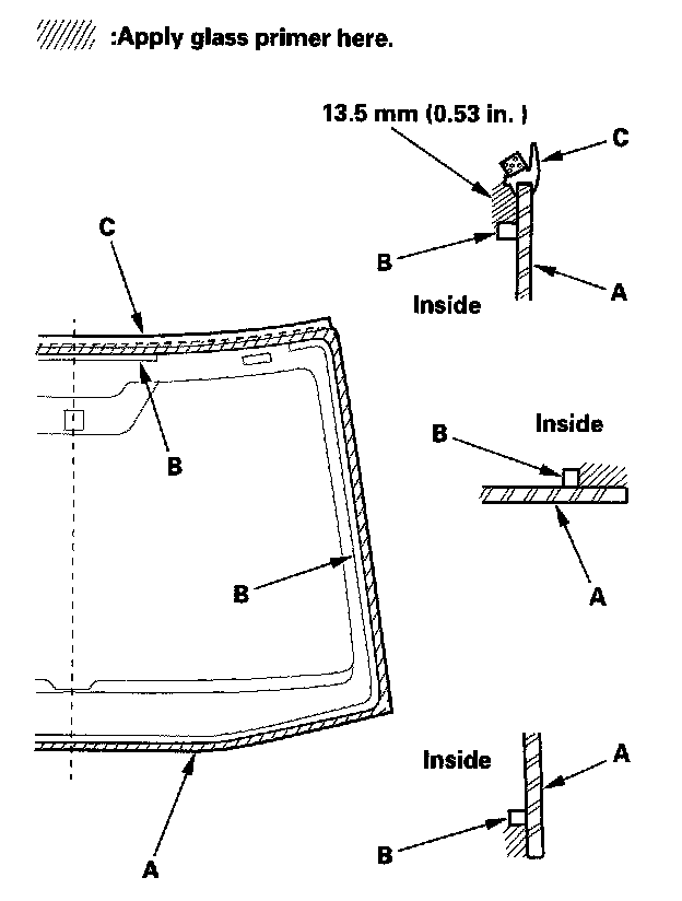 16. With a sponge, apply a light coat of glass primer around the edge of the windshield (A) between the dams (B) and molding (C) as shown, then lightly wipe it off with gauze or cheesecloth: