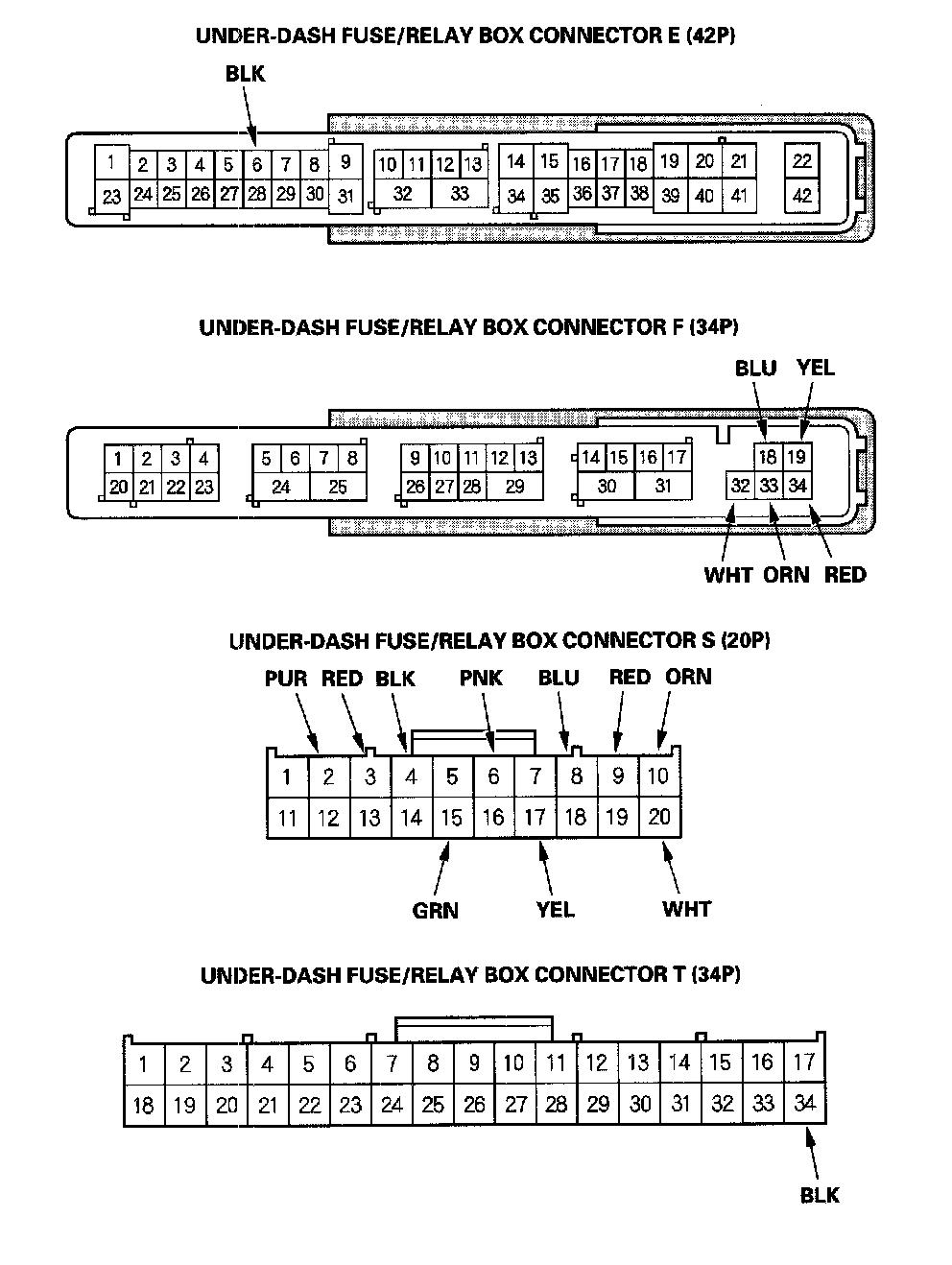 2. Disconnect the under-dash fuse/relay box connectors E, F, S, and T.