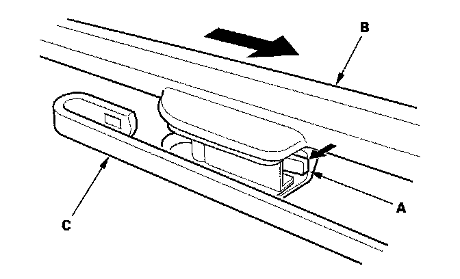 2. Press and hold the tab (A) and side the wiper blade (B) toward the tabs until it releases from the wiper arm (C).