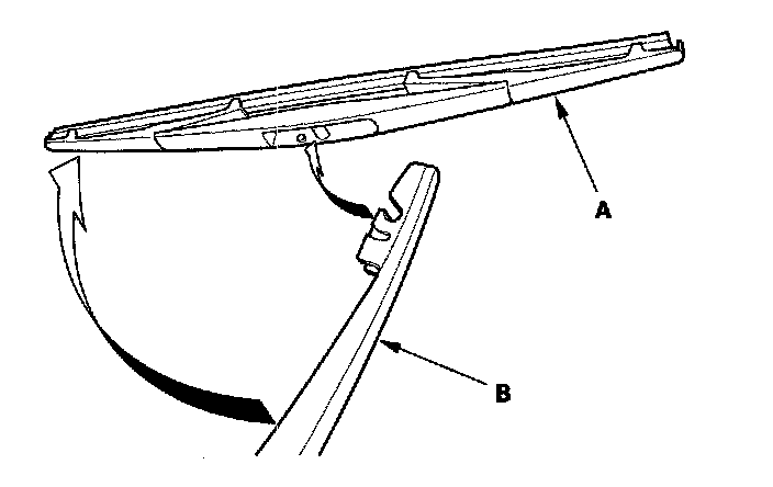 2. Turn the rear wiper blade (A), release the lock, and then remove the wiper blade from the rear wiper arm (B).
