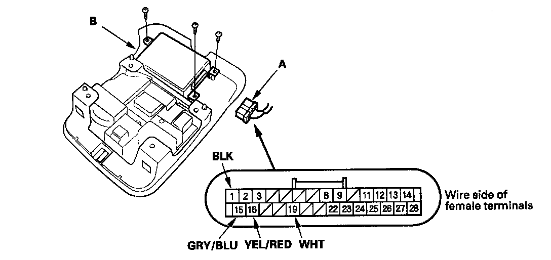 2. Disconnect the 28P connector (A) from the HandsFreeLink control unit (B).