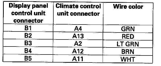 5. Check for continuity between display panel control unit connector B (5P) and climate control unit connector A (20P) according to the table.