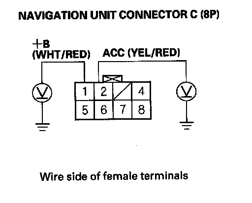 3. Measure the voltage between body ground and navigation unit connector C (8P) terminals No. 1 and No. 2 individually.