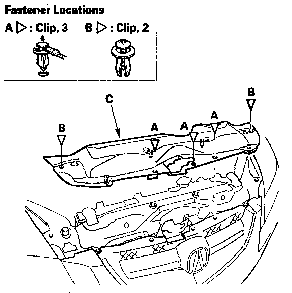 3. Detach the clips (A, B), then remove the front bulkhead cover (C).