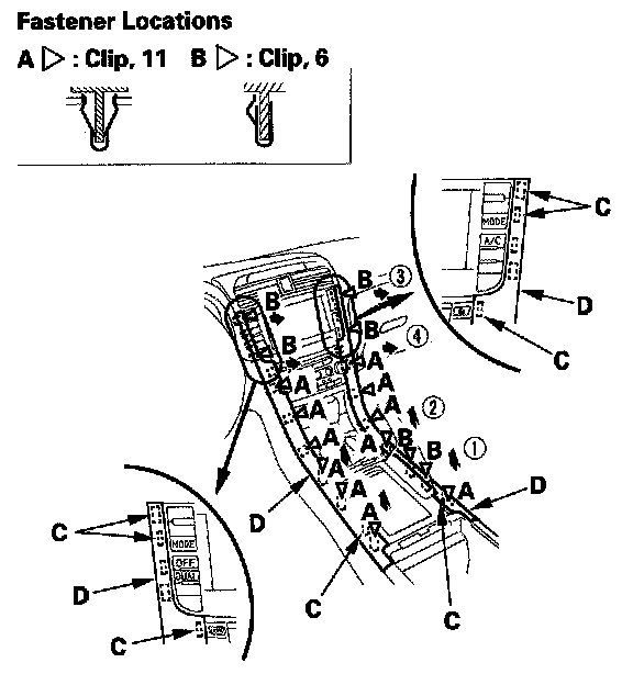 1. Detach the clips (A, B), and release the hooks (C) by pulling the center console trim (D) from both sides.