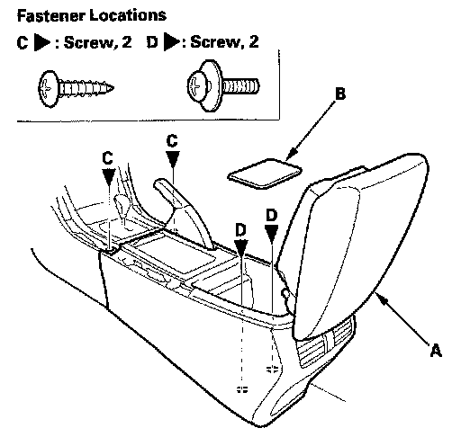 2. Open the console box lid (A) then remove the console mat (B) and screws (C, D).