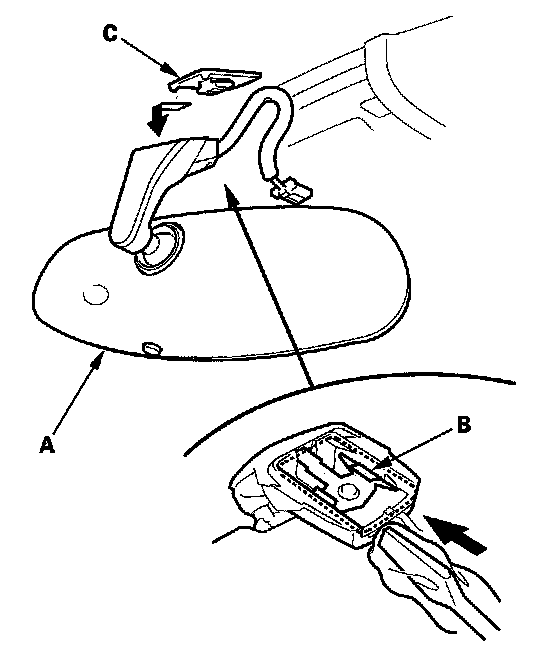 3. Slide the rearview mirror (A) forward to release the spring (B) by gently tapping the mirror bracket with a flat4ip screwdriver wrapped with a clean shop towel and a plastic hammer. Remove the mirror from the lug (C).