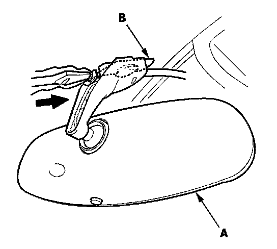 5. Install the rearview mirror (A) by sliding it over the lug (B) until the spring contacts the lug. Gently tap the mirror bracket with a flat-tip screwdriver wrapped with a clean shop towel and a plastic hammer. Be careful not to damage the wires.