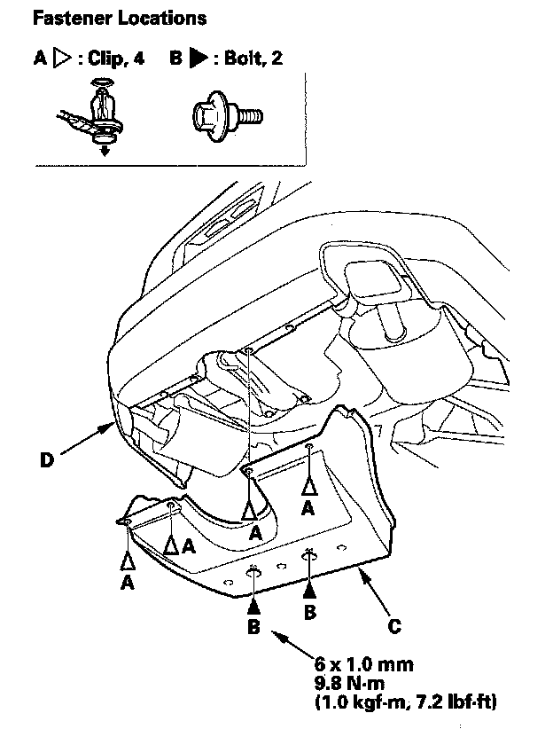 Rear Undercover Replacement1. Remove the clips (A) and bolts (B), then remove the rear undercover (C). Take care not to scratch the rear bumper (D).