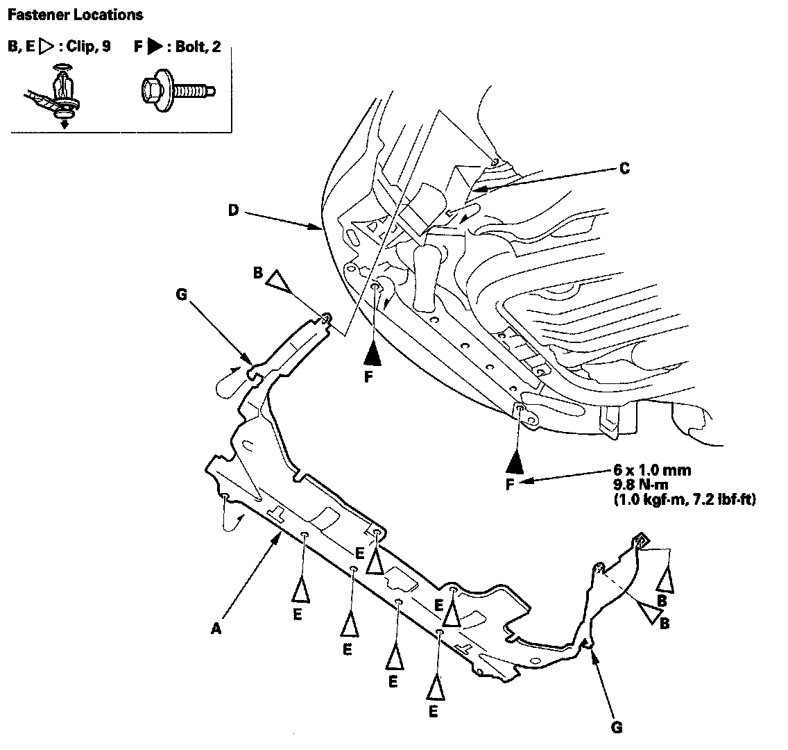 2. From under the front bumper (D), remove the clips (E), and bolts (F).