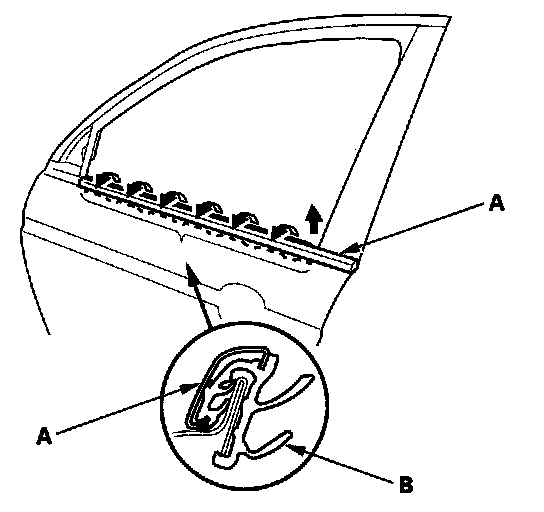 4. Starting at the rear, pull the door glass outer weatherstrip (A) up at each portion where the inner molding (B) catches the inside edge of the window slot, then remove the weatherstrip.