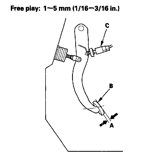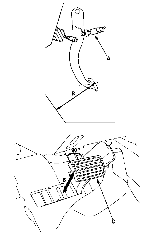 1. With the ignition switch off, inspect the pedal free play (A) on the brake pedal pad (B) by pushing the brake pedal by hand. If the brake pedal free play is insufficient, it may result in excessive brake drag. Check the brake pedal position switch (C) adjustment.