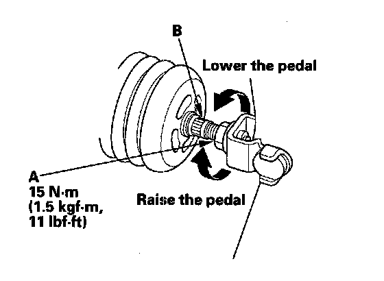 3. Loosen the pushrod locknut (A), and screw the pushrod (B) in or out with pliers until the standard pedal height from the floor is reached. After adjustment, tighten the locknut firmly. Do not adjust the pedal height with the pushrod pressed.