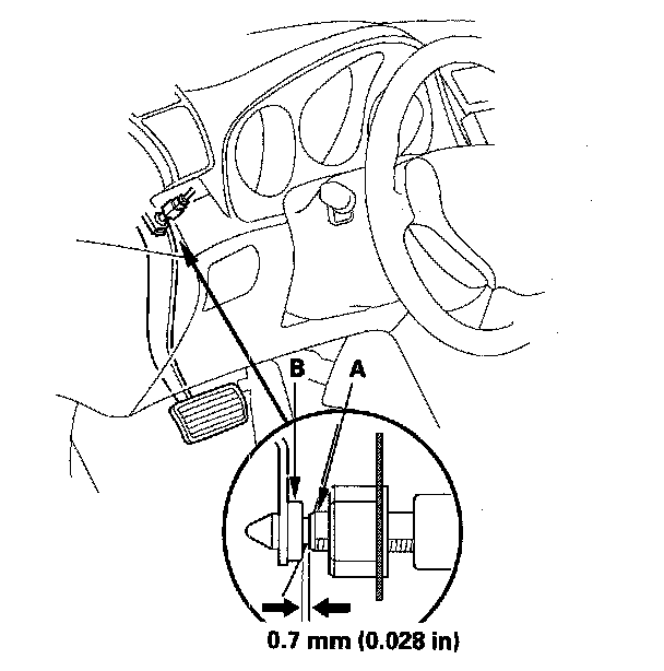 4. Pull up on the brake pedal, then push in the brake pedal position switch until its plunger is fully pressed (threaded end (A) touching the pad (B) on the pedal arm). Then, turn the switch 45° clockwise to lock it. The gap between the brake pedal position switch and the pad is automatically adjusted to 0.7 mm (0.028 in.) by locking the switch. Make sure the brake lights go off when the pedal is released.