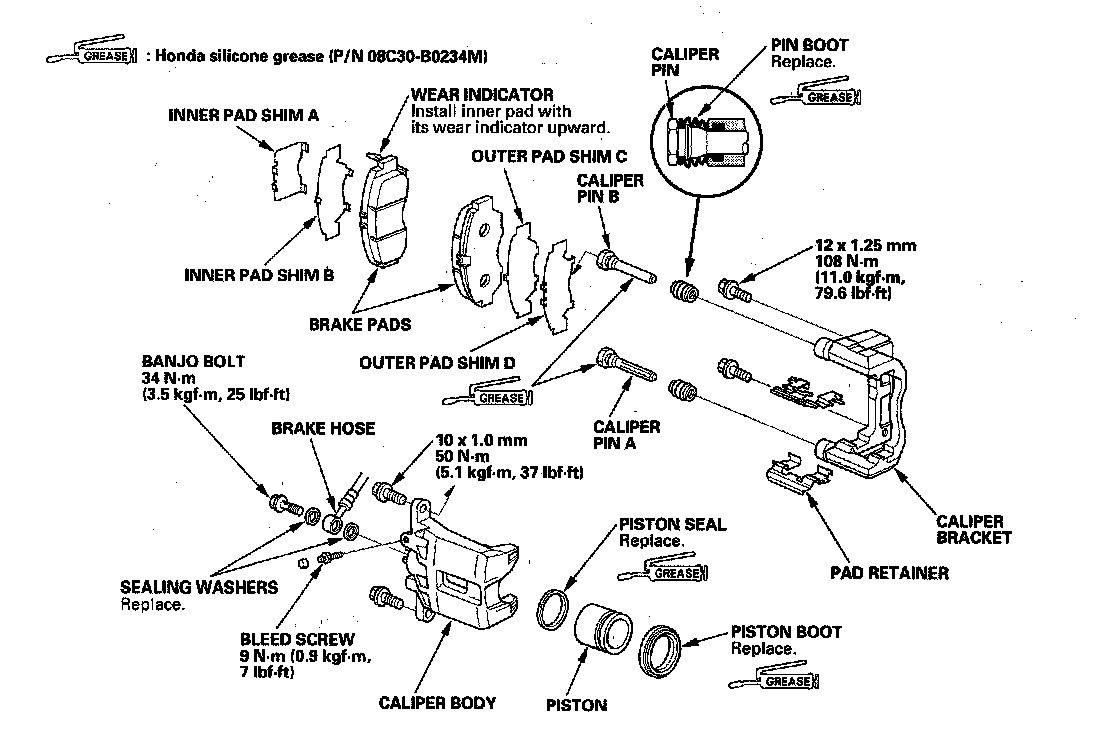 NOTE: Make sure that the caliper pins are installed correctly. Upper caliper pin B and lower caliper pin A are different. If the these caliper pins are installed in the wrong location, it will cause vibration, uneven or rapid pad wear, and possibly uneven tire wear.