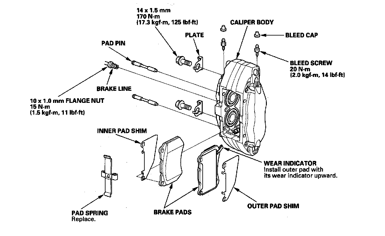 ^ After installing the caliper, check the brake hose and line for leaks, interference, and twisting.