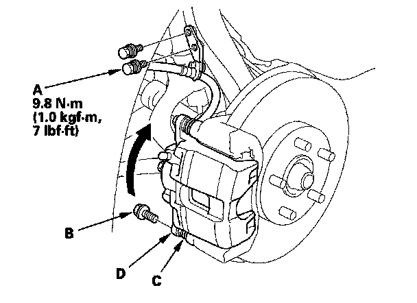 5. Remove the flange bolt (B) while holding the caliper pin (C) with a wrench being careful not to damage the pin boot, and pivot the caliper (D) up out of the way. Check the hose and pin boots for damage and deterioration.