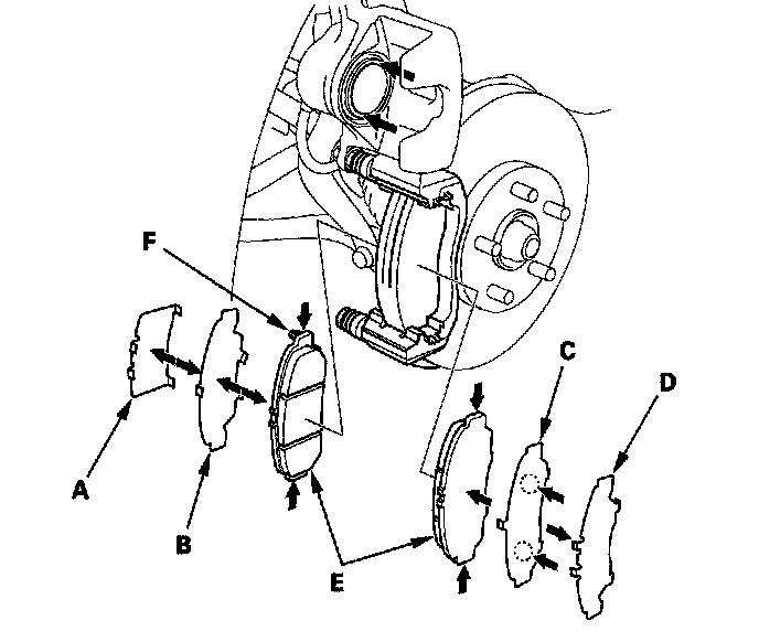 15. Install the brake pads and pad shims correctly. Install the brake pad with the wear indicator (F) on the upper-inside. If you are reusing the brake pads, always reinstall the brake pads in their original positions to prevent a momentary loss of braking efficiency.