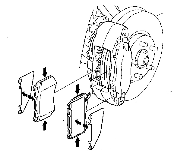 11. Apply Molykote CU-7439 PLUS PASTE to the pad side of the shims (A), the back of the brake pads (B) and the other areas indicated by the arrows. Wipe excess assembly paste off the pad shims and brake pads. Contaminated brake discs or brake pads reduce stopping ability. Keep grease assembly paste off the brake disc and pads.