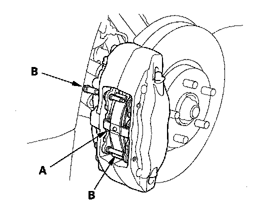 8. Clean the caliper bracket (B) thoroughly; remove any rust, and check. for grooves and cracks.