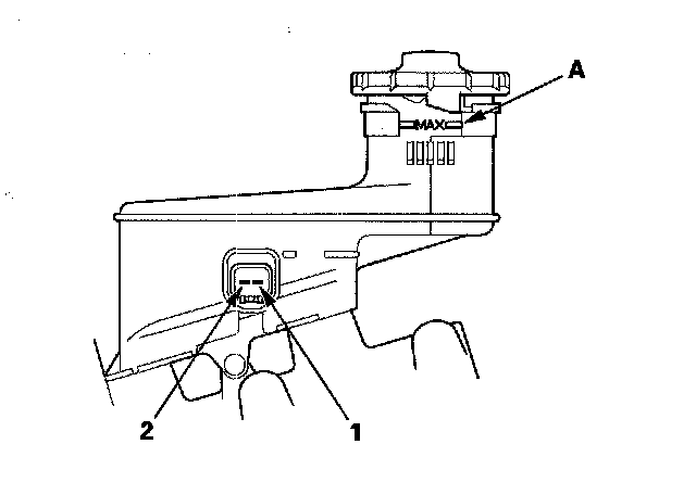 ^ Fill the reservoir with brake fluid to the MAX (upper) level (A). With the float up, there should be no continuity.