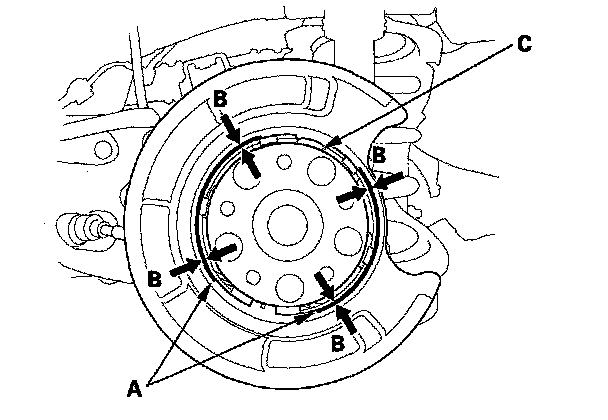 7. Check the hub (C) for smooth operation. If it requires servicing, replace the hub bearing unit.