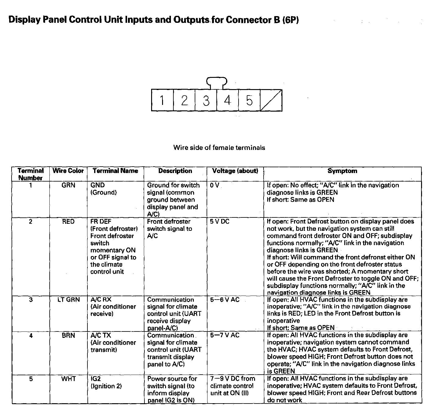 Display Panel Control Unit Inputs And Outputs For Connector B (6P):