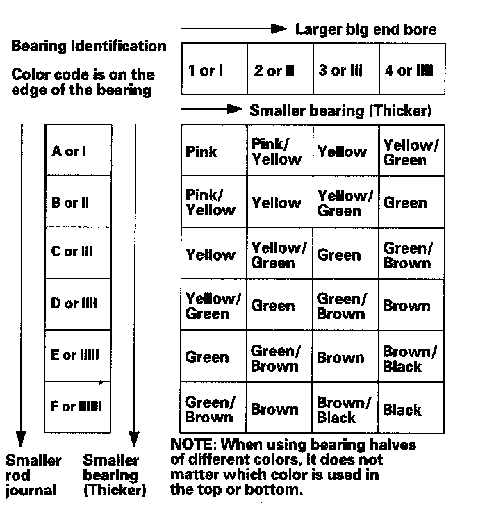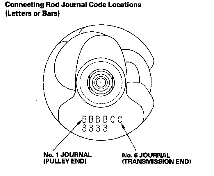 Numbers or bars have been stamped on the side of each connecting rod as a code for the size of the big end. Use them, and the letters or bars stamped on the crank (codes for rod journal size), to choose the correct bearings. If the codes are indecipherable because of an accumulation of dirt and dust, do not scrub them with a wire brush or scraper. Clean them only with solvent or detergent.