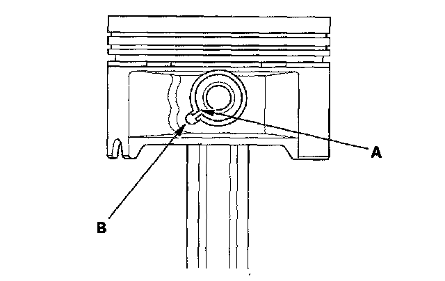 2. Apply new engine oil to the piston pin snap rings (A) and turn them in the ring grooves until the end gaps are lined up with the cutouts in the piston pin bores (B).