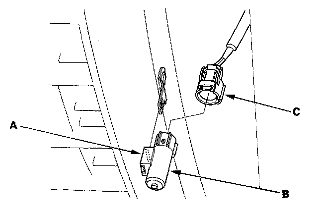 Outside Air Temperature Sensor Replacement1. Lift the tab (A) to release the lock, then remove the outside air temperature sensor (B) from the back of the front bumper beam. Disconnect the 2P connector (C) from the outside air temperature sensor.