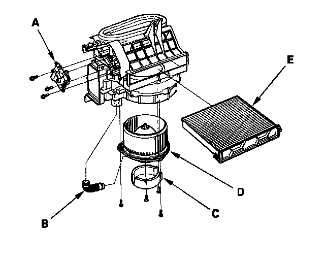 - The recirculation control motor (A), blower motor cooling hose (B), blower motor cover (C), the blower motor (D), and the dust and pollen filter (E) can be replaced without removing the blower unit.