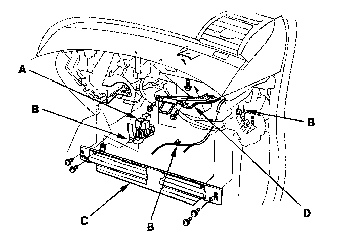 2. Remove the relays (A) and the wire harness clips (B), then remove the bolts and the glove box frame (C). Remove the self tapping screws, and the glove box striker (D).
