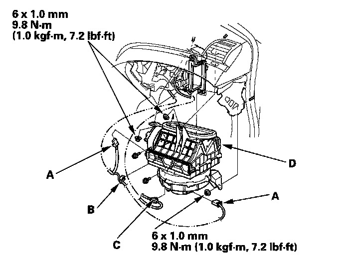 3. Disconnect the connectors (A) from the blower motor, and the recirculation control motor, then remove the wire harness clip (B) and the connector clip (C). Remove the mounting nuts, the mounting bolts and the blower unit (D).