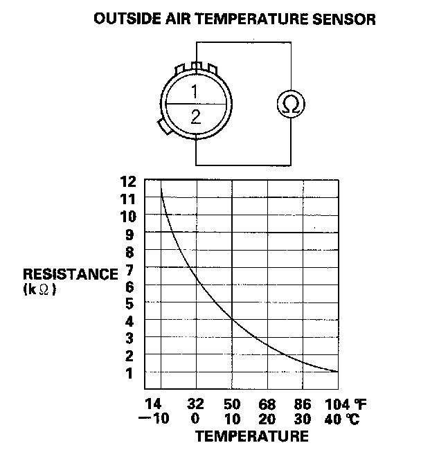 3. Compare the resistance reading between the No. 1 and No. 2 terminals of the outside air temperature sensor with the specifications shown in the graph; the resistance should be within the specifications.