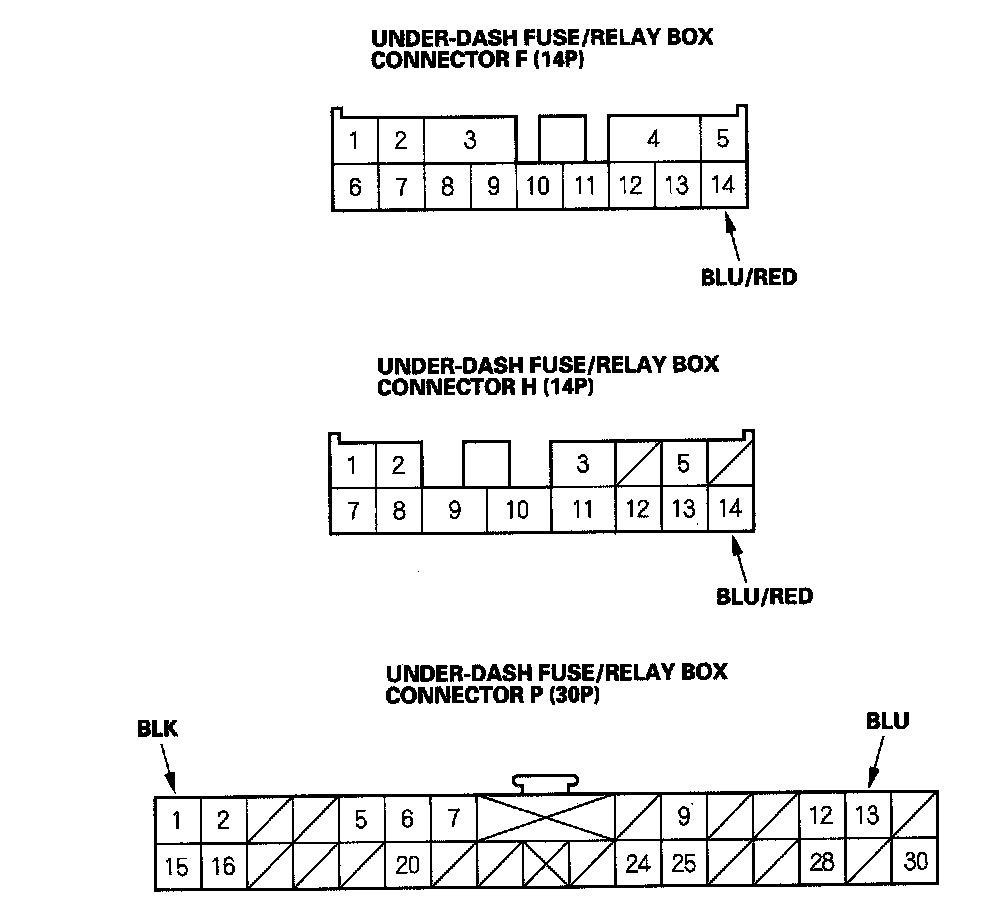 4. Disconnect the under-dash fuse/relay box connectors F, H and P.