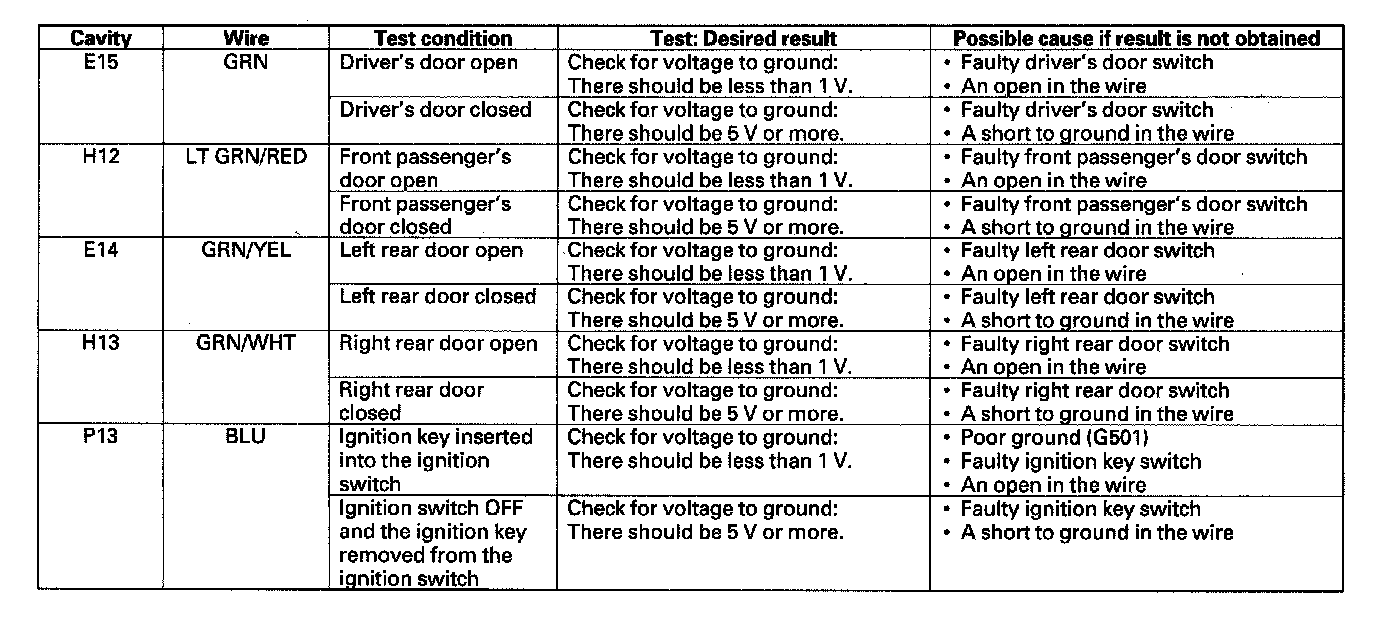 11. Reconnect the connector to the door multiplex control unit. Turn the ignition switch ON (II), and make these input tests at the appropriate connector.