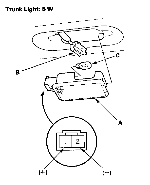 4. Check for continuity between the No. 1(+) and No. 2(-) terminals. There should be continuity. If there is no continuity, check the bulb (C). If the bulb is OK, replace the trunk light.