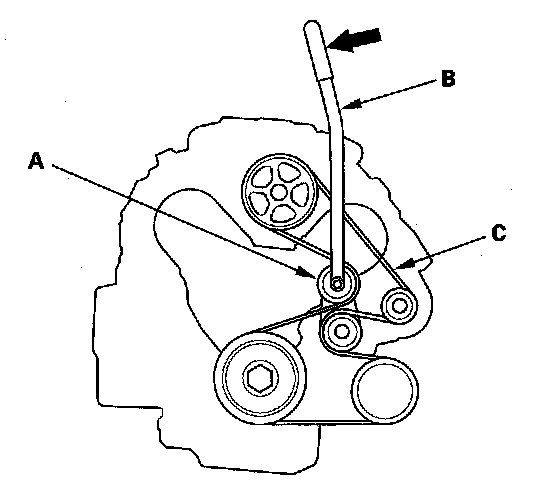 2. Move the auto-tensioner (A) using the belt tension release tool (B) to relieve tension from the drive belt (C), then remove the drive belt.