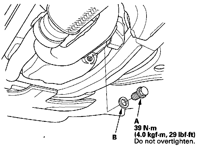 3. Reinstall the drain bolt with a new washer (B).