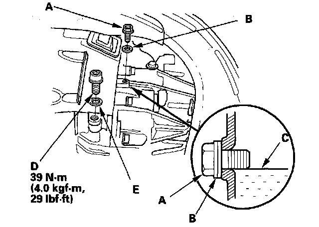 3. Remove the check bolt (A) and washer (B). Check the condition of the fluid and make sure it is at the proper level (C). If the fluid is dirty, remove the drain plug (D) and washer (E).
