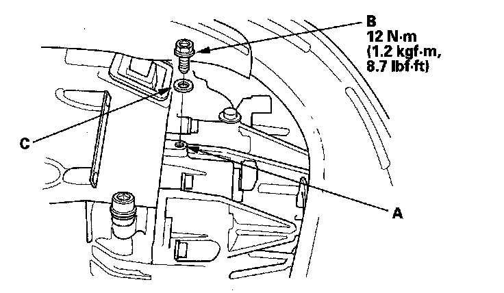 14. After the fluid stops overflowing, install the check bolt (B) with a new washer (C).