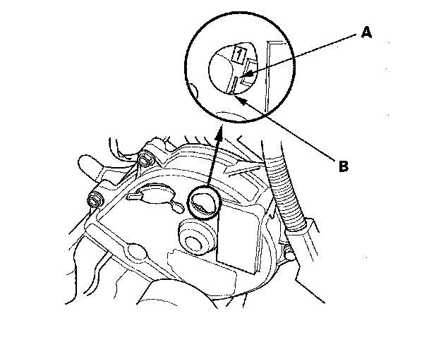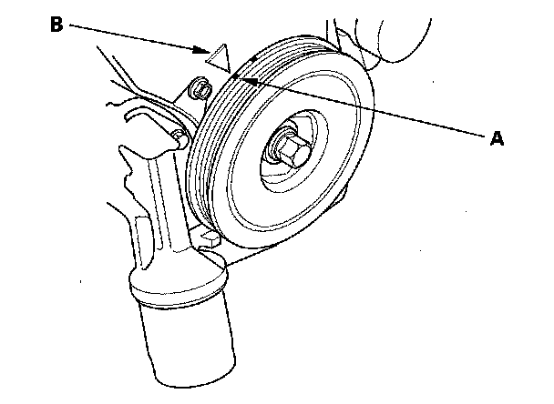 2. Turn the crankshaft so its white mark (A) on the crankshaft pulley lines up with the pointer (B).