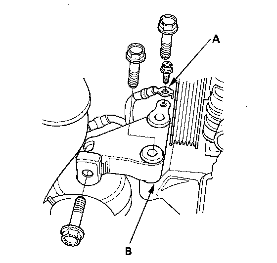 8. Remove the ground cable (A), then remove the upper half of the side engine mount bracket (B).