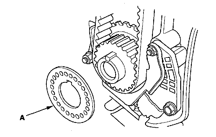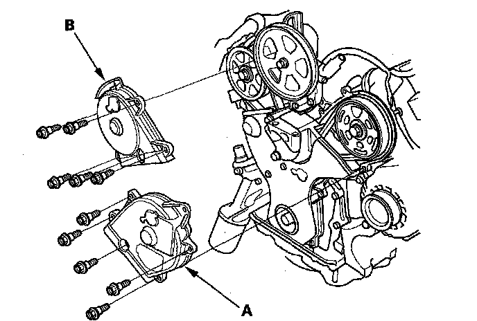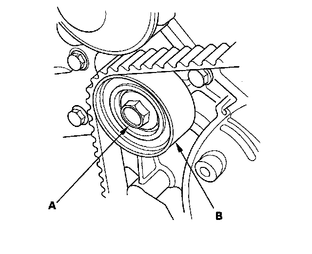 16. Remove the idler pulley bolt (A) and idler pulley (B), then remove the timing belt. Discard the idler pulley bolt.